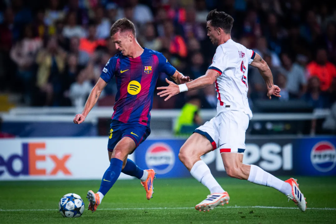 第26分钟,佩德里妙传,奥尔莫弧顶处劲射,皮球碰到后卫折射出底线。